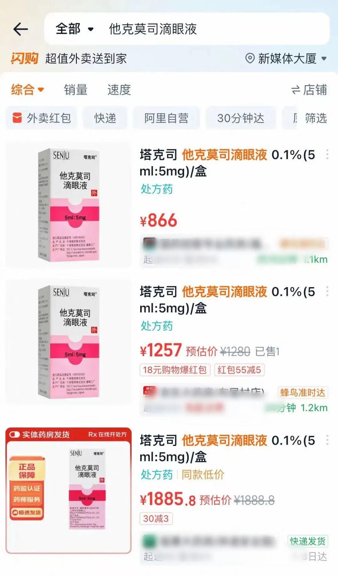 记者在淘宝闪购上搜索发现,深圳有两家门店有该眼药水售卖,其中一家药店的价格为866元,另一家则涨价到了1257元,而快递网购店更是涨价到了1885元。