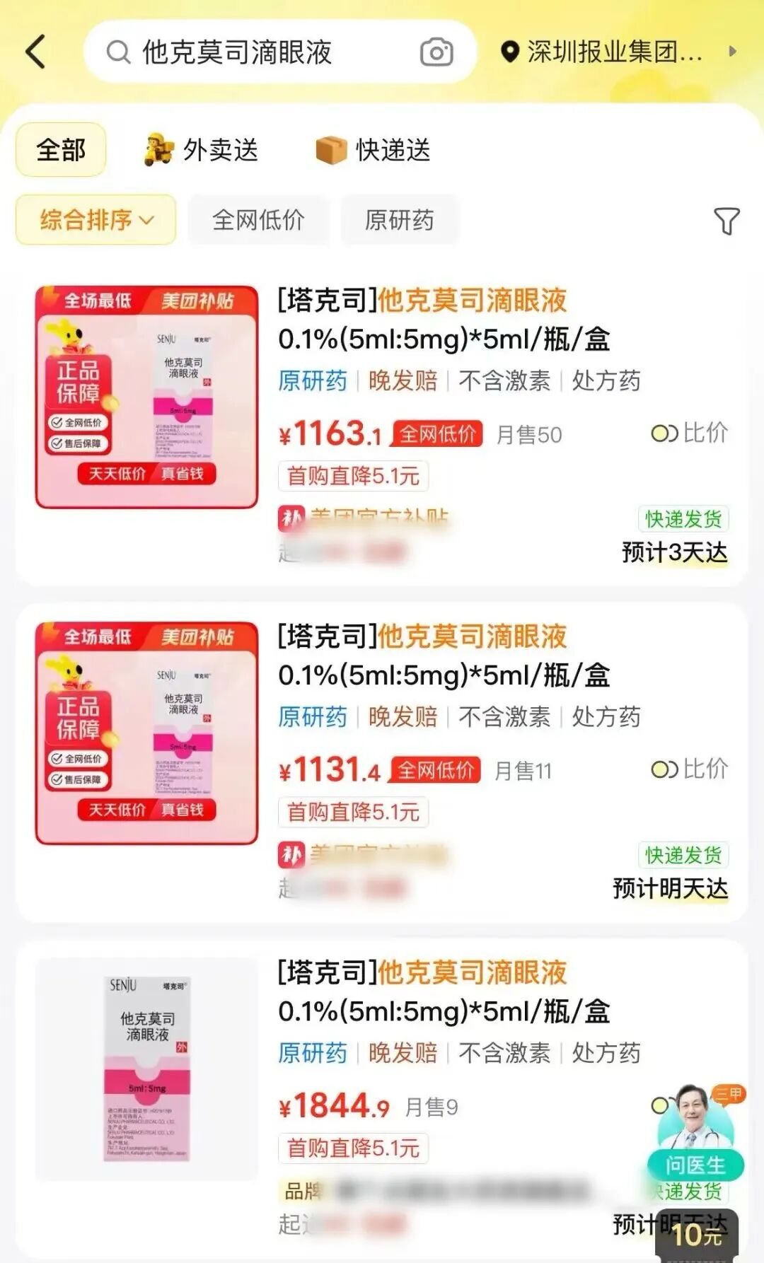深圳新闻网记者在美团买药平台上搜索发现,目前深圳没有门店在平台上售卖这款眼药水,只有快递网店显示可以隔天送达,价格在1100元-1800元之间。