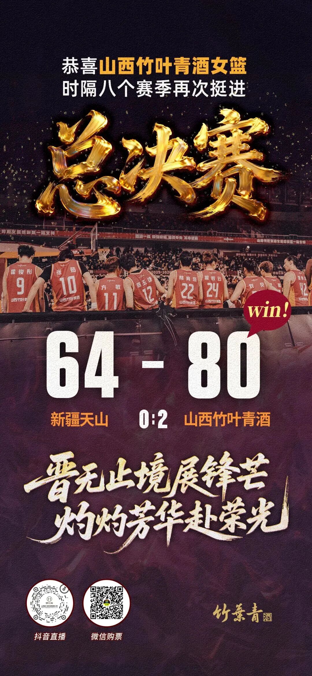 4月8日,2025-2026赛季WCBA联赛季后赛半决赛战罢。山西竹叶青酒女篮客场以80比64大胜新疆队,从而以总比分2比0淘汰对手晋级总决赛。