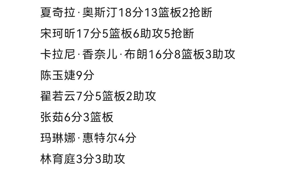 翟若云作为山西女篮的绝对主力,助力山西女篮取得佳绩,自己则入选国家队。在联赛球员数据榜单上,翟若云在得分榜、抢断榜和三分榜上均名列前茅。