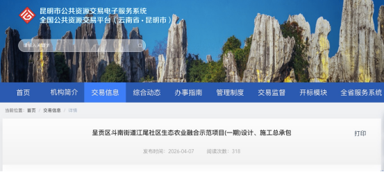 日前,云南省公共资源交易信息网发布“呈贡区斗南街道江尾社区生态农业融合示范项目(一期)设计、施工总承包项目”招标文件预公示。根据公示文件,项目总投资约1202.60万元,本次招标规模约为977.61万元,建设内容涵盖稻渔产业农田改造、机耕道修建、村庄房屋修缮加固三大板块。
