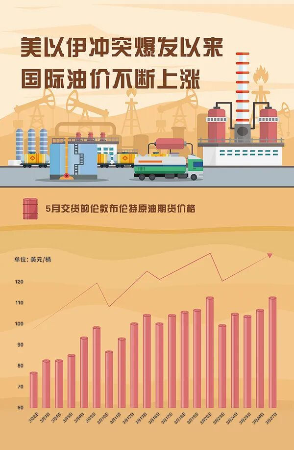 近期,美国和以色列对伊朗发动军事打击,扰乱全球能源供应体系,霍尔木兹海峡航运持续受阻,国际油价大幅上涨。图为5月交货的伦敦布伦特原油期货价格从3月2日收盘价每桶77.74美元,上涨至3月27日收盘价每桶112.57美元,累计上涨34.83美元,涨幅为44.8%。 孙彤/制图