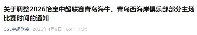 中超联赛青岛赛区、相关中超俱乐部: 为满足球迷观赛需求,经主场俱乐部申请,并协商属地赛区、客队俱乐部及相关方同意后,现决定调整2026怡宝中超联赛青岛海牛、青岛西海岸俱乐部部分主场的比赛时间,其他比赛安排不变,具体调整如下: 请相关赛区及俱乐部按调整后的安排做好办赛和参赛准备。 特此通知。 中国足球职业联赛联合会 2026年4月9日 |