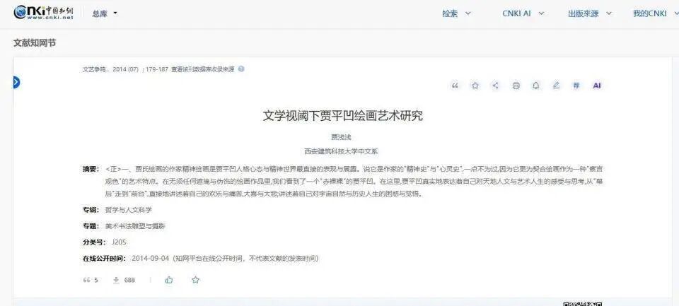 9日上午,极目新闻通过知网等渠道查询获悉,《文学视阈下贾平凹绘画艺术研究》一文,系贾浅浅2014年任西安建筑科技大学教师时所发表,目前可正常下载。