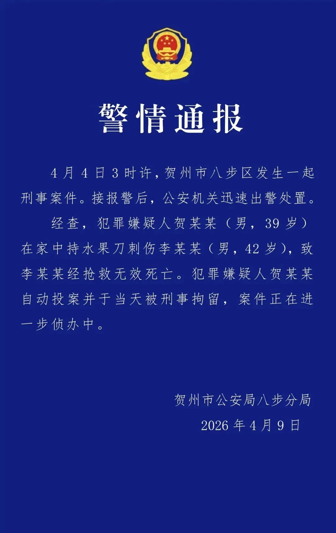 4月4日3时许,贺州市八步区发生一起刑事案件。接报警后,公安机关迅速出警处置。经查,犯罪嫌疑人贺某某(男,39岁)在家中持水果刀刺伤李某某(男,42岁),致李某某经抢救无效死亡。犯罪嫌疑人贺某某自动投案并于当天被刑事拘留,案件正在进一步侦办中。