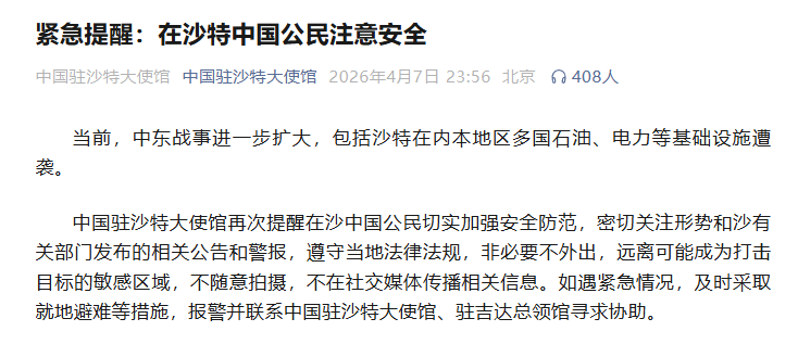 中国驻沙特大使馆再次提醒在沙中国公民切实加强安全防范当前,中东战事进一步扩大,包括沙特在内本地区多国石油、电力等基础设施遭袭。中国驻沙特大使馆再次提醒在沙中国公民切实加强安全防范,密切关注形势和沙有关部门发布的相关公告和警报,遵守当地法律法规,非必要不外出,远离可能成为打击目标的敏感区域,不随意拍摄,不在社交媒体传播相关信息。如遇紧急情况,及时采取就地避难等措施,报警并联系中国驻沙特大使馆、驻吉达总领馆寻求协助。(详情请戳↓↓↓)