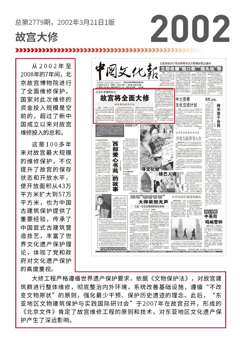 从2002年至2008年的7年间,北京故宫博物院进行了全面维修保护。国家对此次维修的资金投入规模是空前的,超过了新中国成立以来对故宫维修投入的总和。