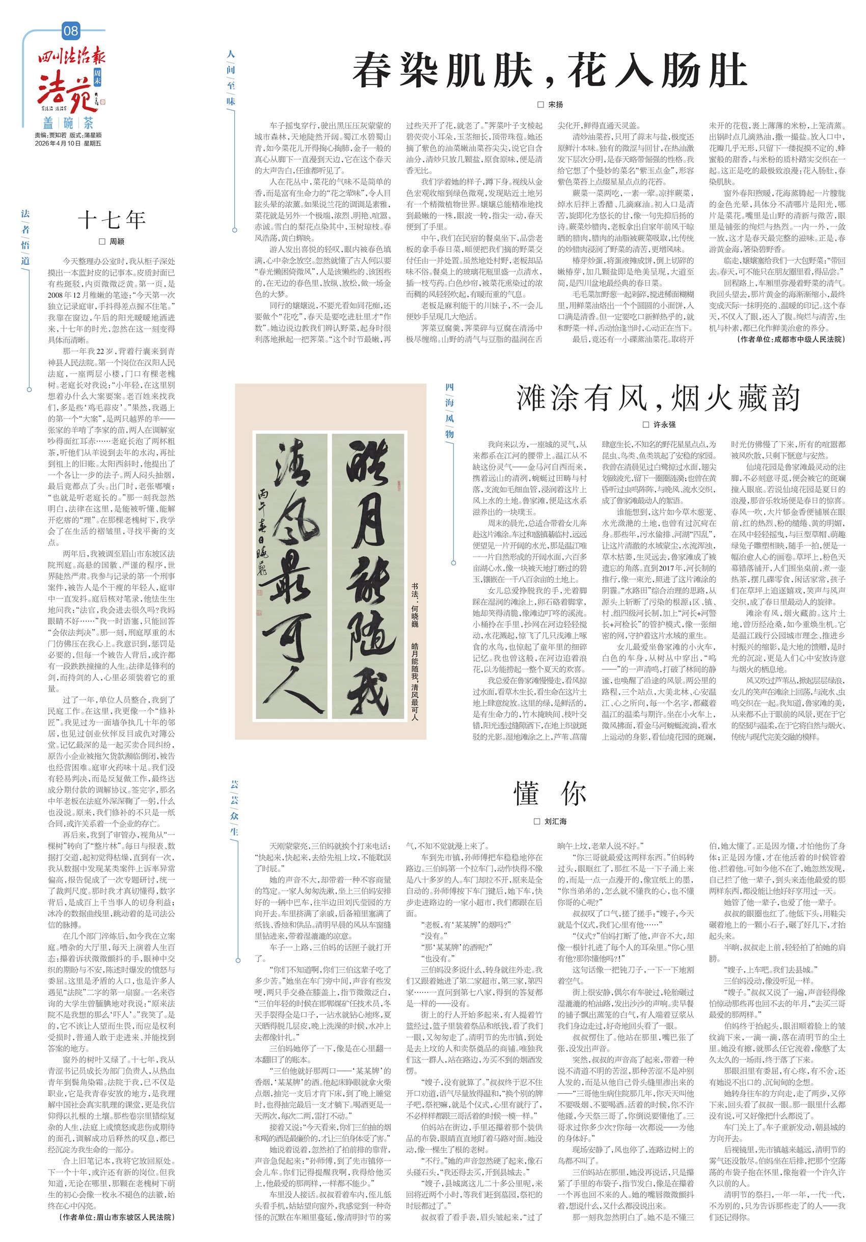 窗外的树叶又绿了。十七年,我从青涩书记员成长为部门负责人,从热血青年到鬓角染霜。法院于我,已不仅是职业,它是我青春安放的地方,是我理解中国社会真实肌理的课堂,更是我信仰得以扎根的土壤。那些卷宗里错综复杂的人生,法庭上或愤怒或悲伤或期待的面孔,调解成功后释然的叹息,都已经沉淀为我生命的一部分。