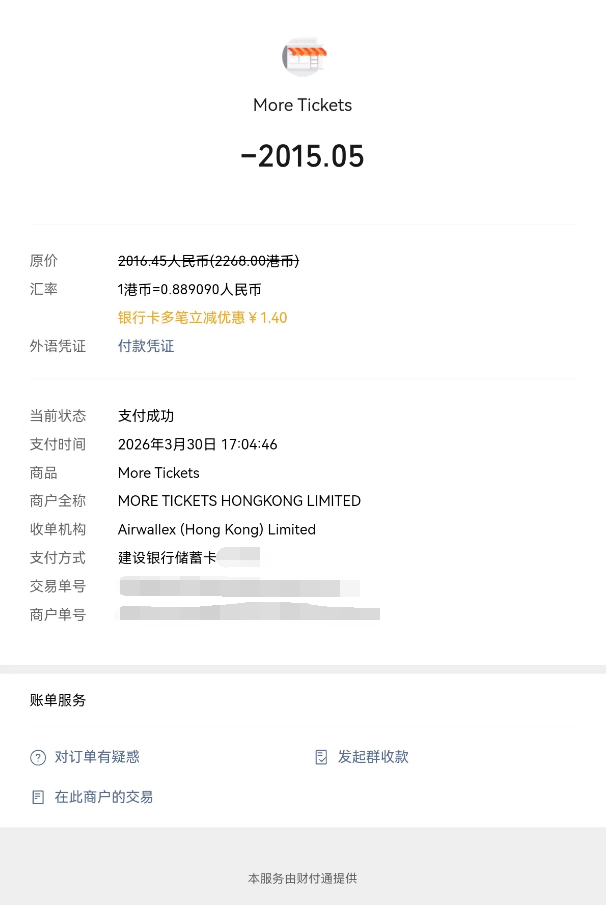 涉事“摩天轮”票务平台发来专项情况说明,解释该订单为中国港澳台地区非实名制购票,此类门票原本不支持退换。