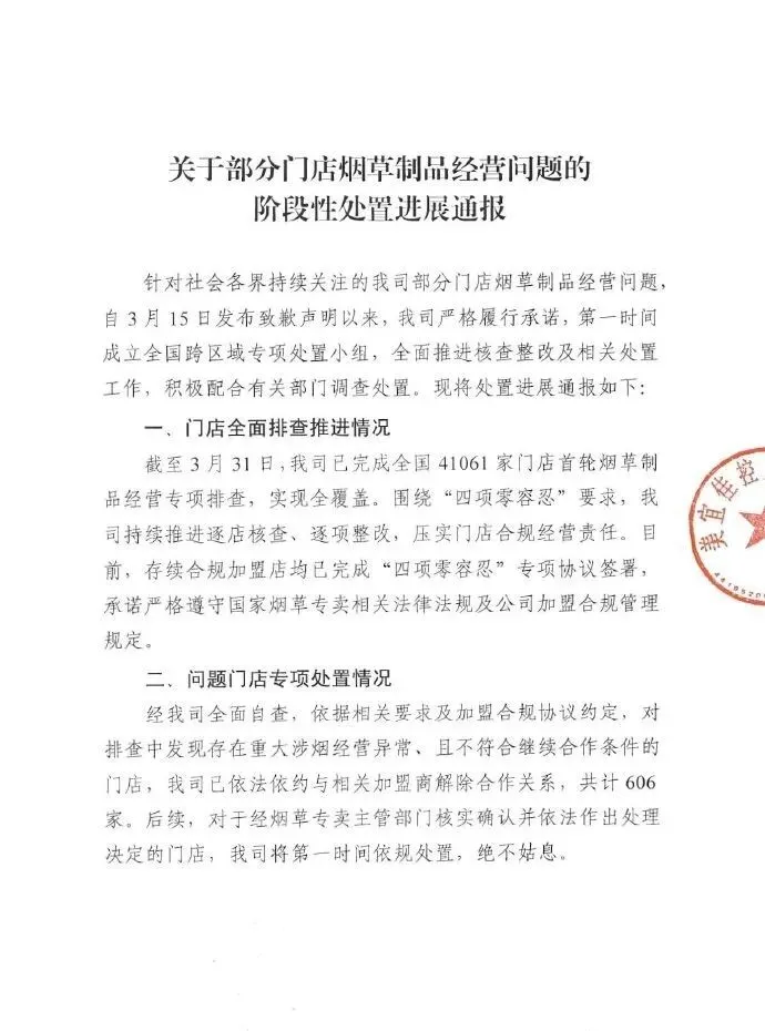 文中提到,“截至3月31日,我司已完成全国41061家门店首轮烟草制品经营专项排查,实现全覆盖。围绕‘四项零容忍’要求,我司持续推进逐店核查、逐项整改,压实门店合规经营责任。目前,存续合规加盟店均已完成“四项零容忍”专项协议签署,承诺严格遵守国家烟草专卖相关法律法规及公司加盟合规管理规定。经我司全面自查,依据相关要求及加盟合规协议约定,对排查中发现存在重大涉烟经营异常、且不符合继续合作条件的门店,我司已依法依约与相关加盟商解除合作关系,共计606家。后续,对于经烟草专卖主管部门核实确认并依法作出处理决定的门店,我司将第一时间依规处置,绝不姑息。”