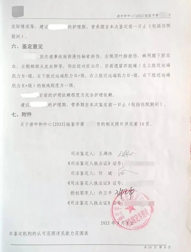 欧阳先生表示,女儿4年前遭遇车祸,醒来后无法说话,四肢瘫痪。后经司法鉴定,认定为肢体一级和精神二级残疾,护理依赖程度为完全护理依赖。