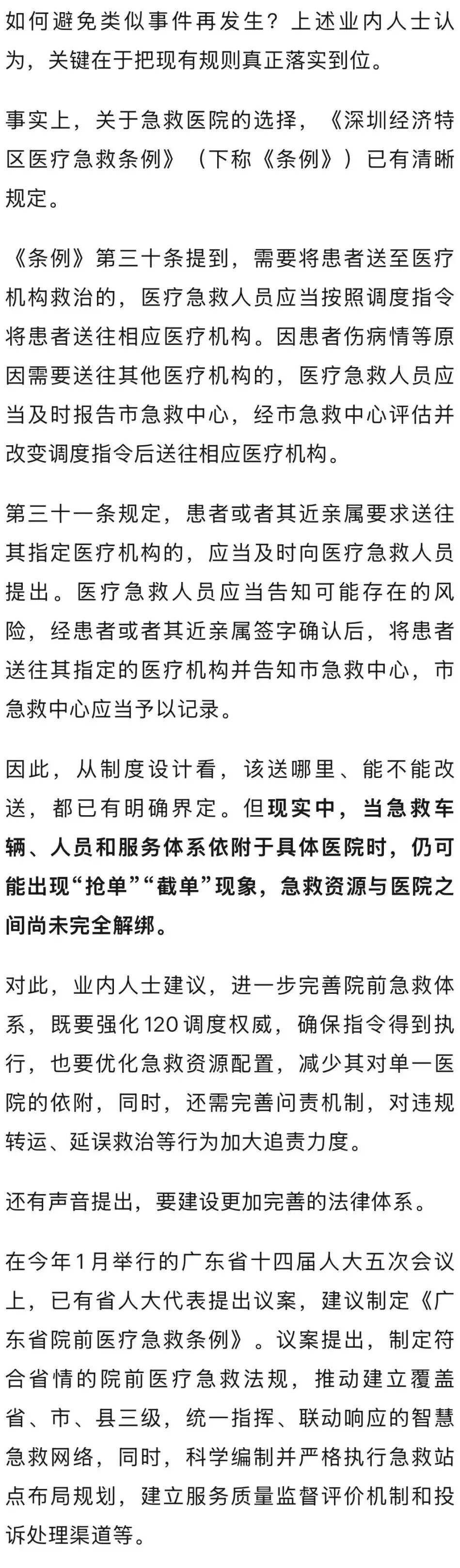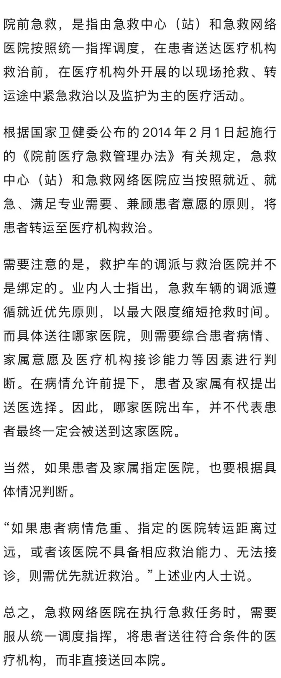 院前急救关乎患者能否得到科学及时地救治,围绕该事件,不少公众关心:急救病人应送往哪里、遵循哪些原则?若未按120调度指令执行,又该如何追责?