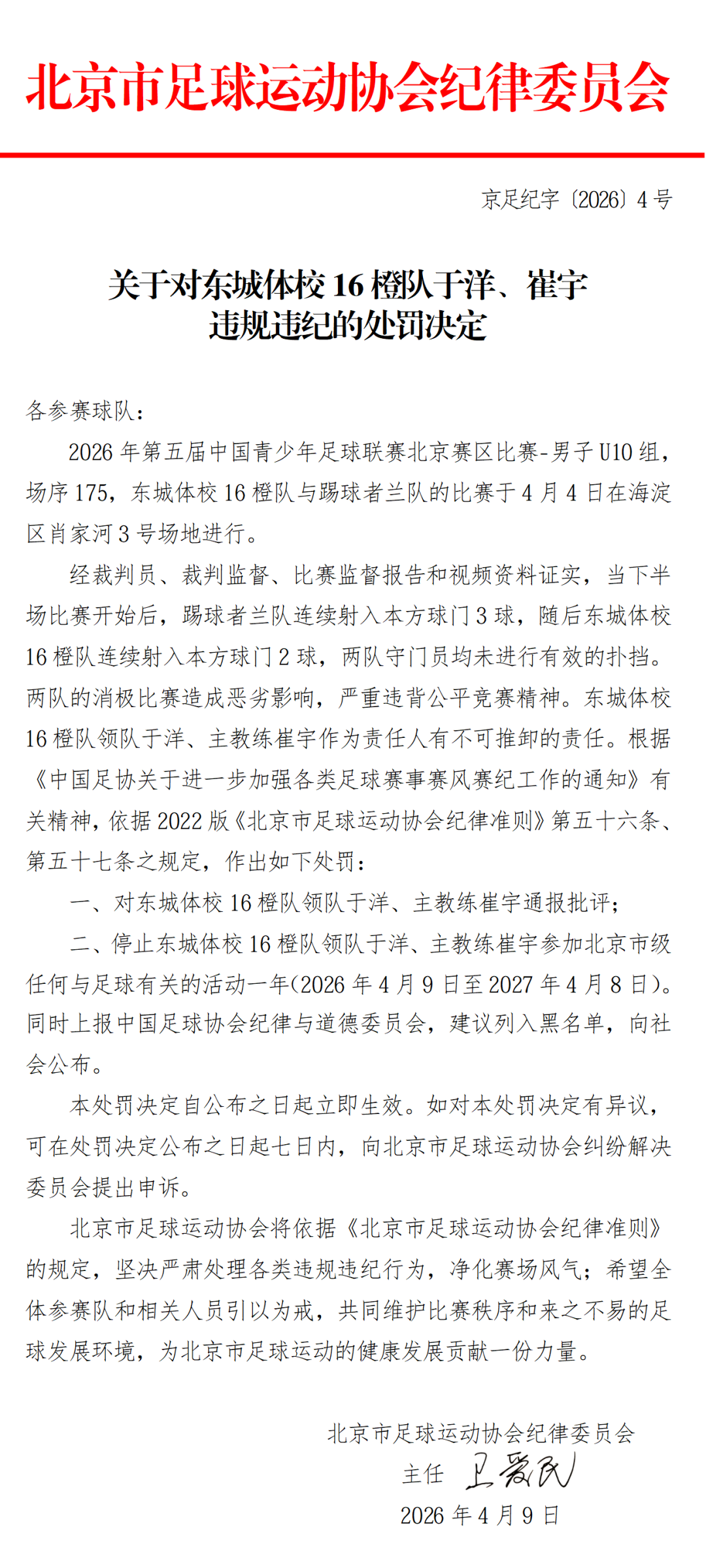 4月9日,北京足协发布四条处罚决定,对中青赛北京赛区U10组东城体校16橙队和踢球者兰队在比赛中互射本方球门的行为处以取消赛事资格,两队领队及主教练均被禁赛一年。
