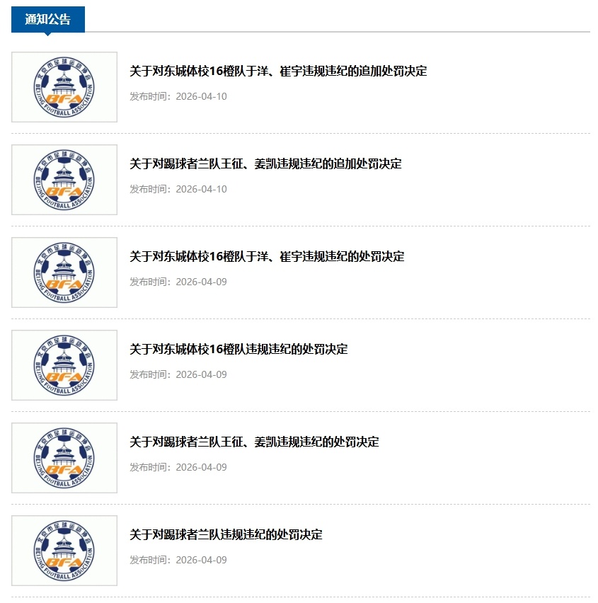 4月10日,中国足协网站发布关于2026年第五届中国青少年足球联赛北京赛区男子U10组比赛发生严重虚假比赛情况的通报: