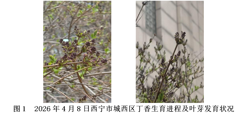 目前丁香处于花苞现蕾期(图1),根据前期气候条件、丁香开花期预报指标和生长发育现状,结合4月中旬~5月气候趋势预测,预计2026年西宁丁香始花期为4月15日~21日,盛花期为4月22日~5月2日,末花期为5月6日~12日,较常年均提前2~4天。
