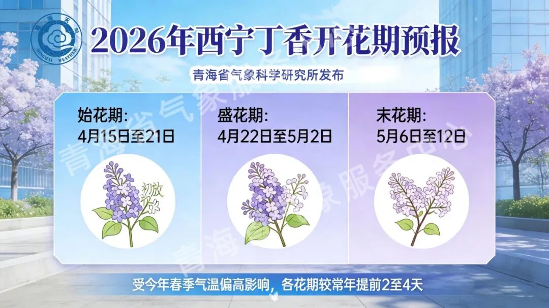 根据省气候中心预测:与常年同期相比,4月下旬至5月中旬西宁降水量偏多、气温正常略高,预计第一场透雨在4月下旬出现,与历史平均日期持平。4月中旬至5月中旬水热条件较好,有利于丁香开花。
