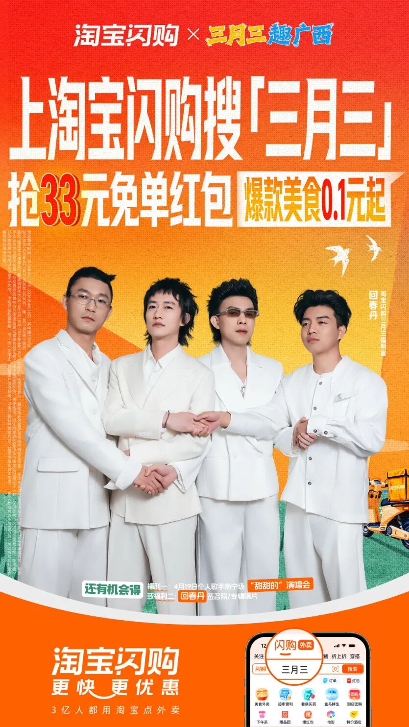 据了解,本土知名乐队@回春丹 将作为淘宝闪购“三月三”福利官,为广西消费者送出众多福利。