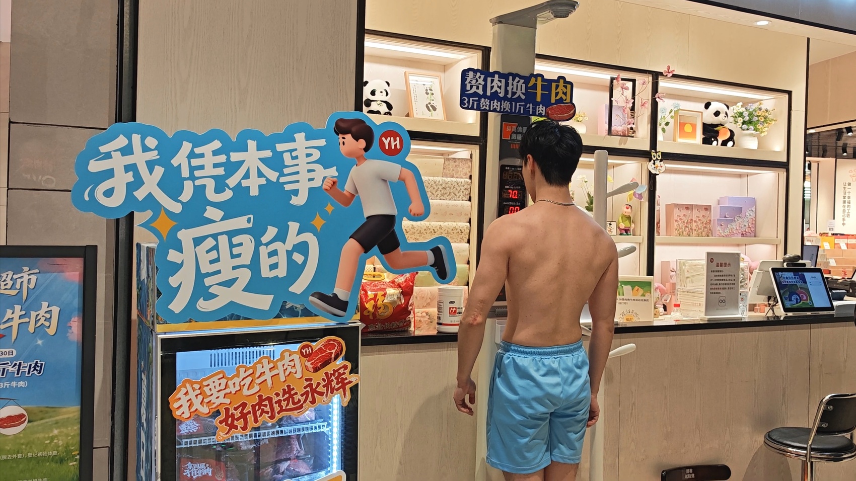 当天上午,永辉超市成都锦江文华店迎来首波兑奖高峰。“我硬是把身上的‘肥嘎嘎’换成了牛肉,健康减肥我最‘凶’,巴适得板。”一位成功兑奖的顾客拿着一盒鲜牛肉向同行的朋友“炫耀”,盒子上贴有“拿回属于你的肉”字样。
