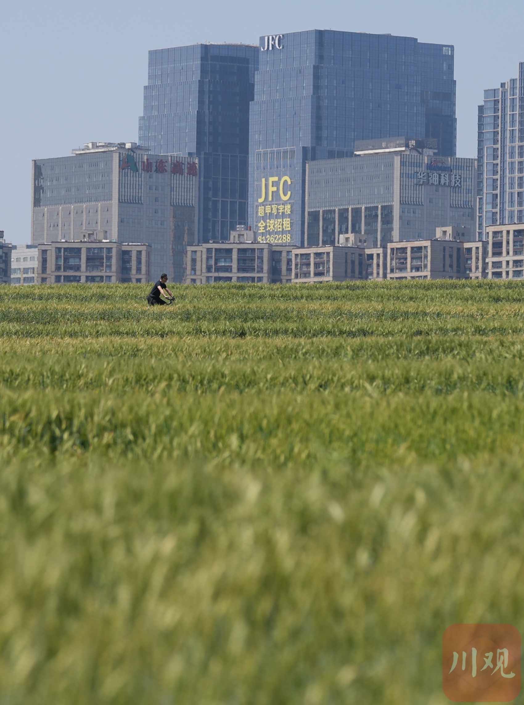 4月9日,位于成都高新区复地金融岛东岸的环城生态区麦田长势喜人,青绿色的麦浪在风中轻轻起伏。