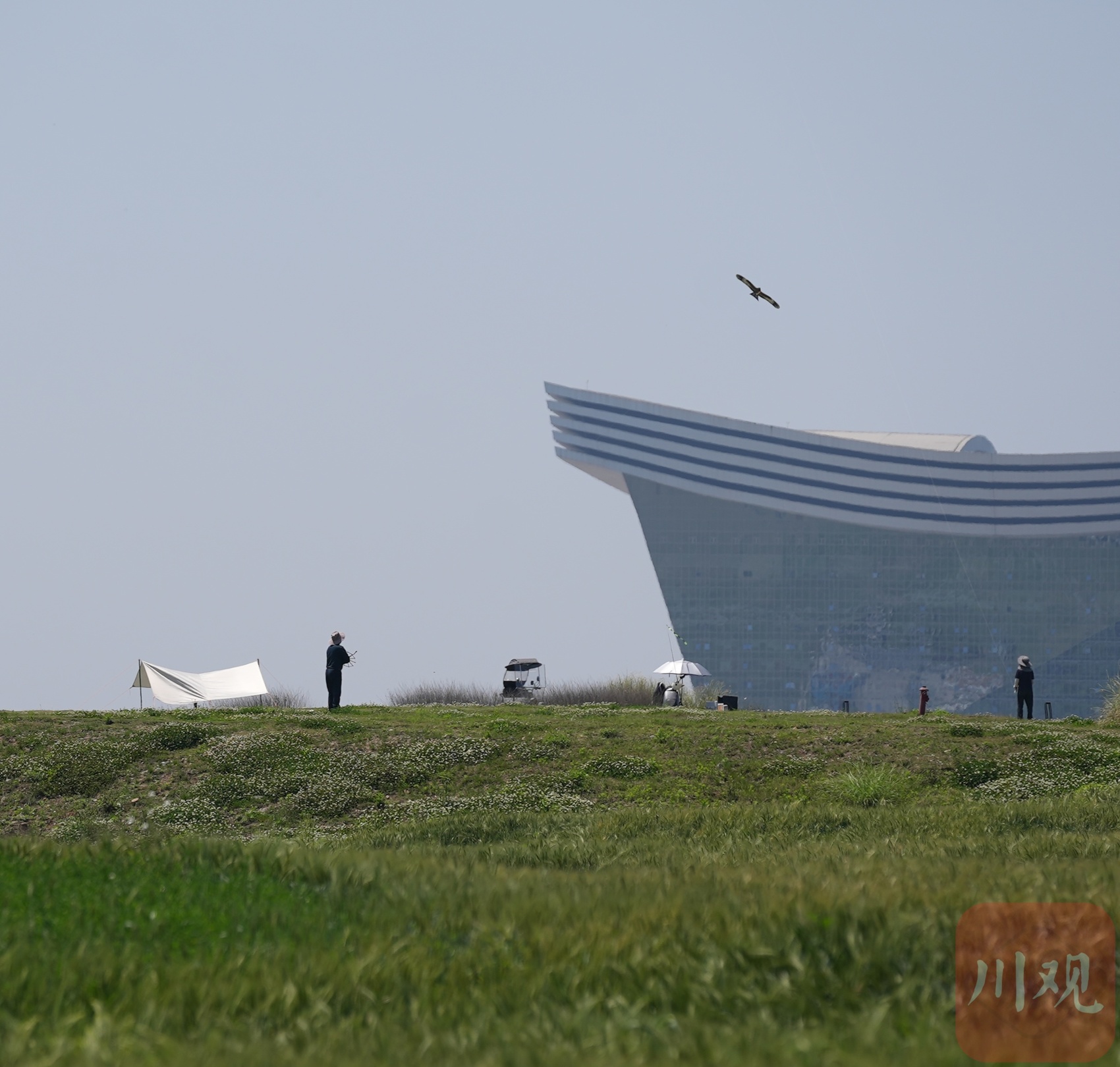 4月9日,在环城生态区麦田,现代都市的繁华与田园乡野的诗意相互交融,构成一幅“城田共生” 画卷。