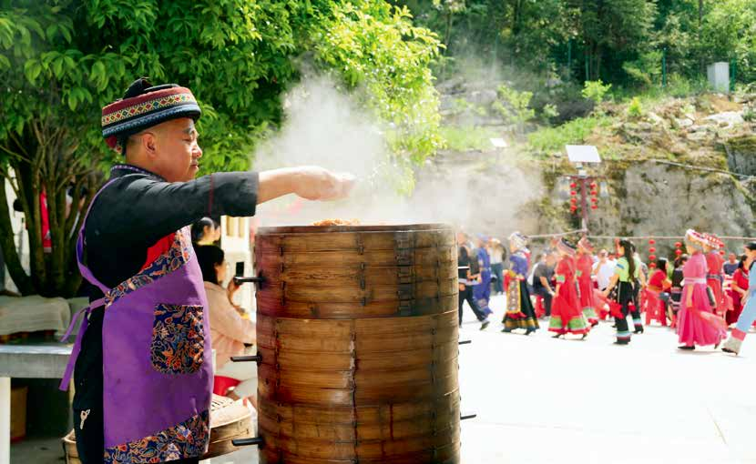 作为世界上延续时间最长、发展体系最完备的农业文明形态之一,中华农耕文明在历史长河中绵延数千年,显示出强大的生命力和应对各种挑战的韧性。以农耕文明为根基孕育出的优秀传统文化,见证着我们一脉相承的来时路,也支撑着当代乡村振兴持续向好发展。非遗,正是其中浓墨重彩的一笔。在《川味 5》的 24 场宴席中,客家宴上唱响的客家山歌,端午宴上激烈的龙舟会,豆腐宴上热闹的牛灯舞,涵 40 余项非遗代表性项目在一场场宴席中悉数呈现,不仅承载着集体共同的情感记忆,也串联起一幅幅充满生机的美好乡土图景,借由餐桌这一方小“舞台”,不断清晰延续着四川深厚而鲜活的文化脉络。