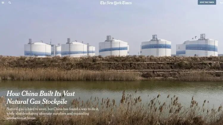 《纽约时报》的记者近日探访了中国工业港口城市——江苏盐城,报道了那里的六座巨型储气罐。报道说,每一座储气罐都储存着足够多的天然气,足以满足2200万人口两个多月的家庭需求。