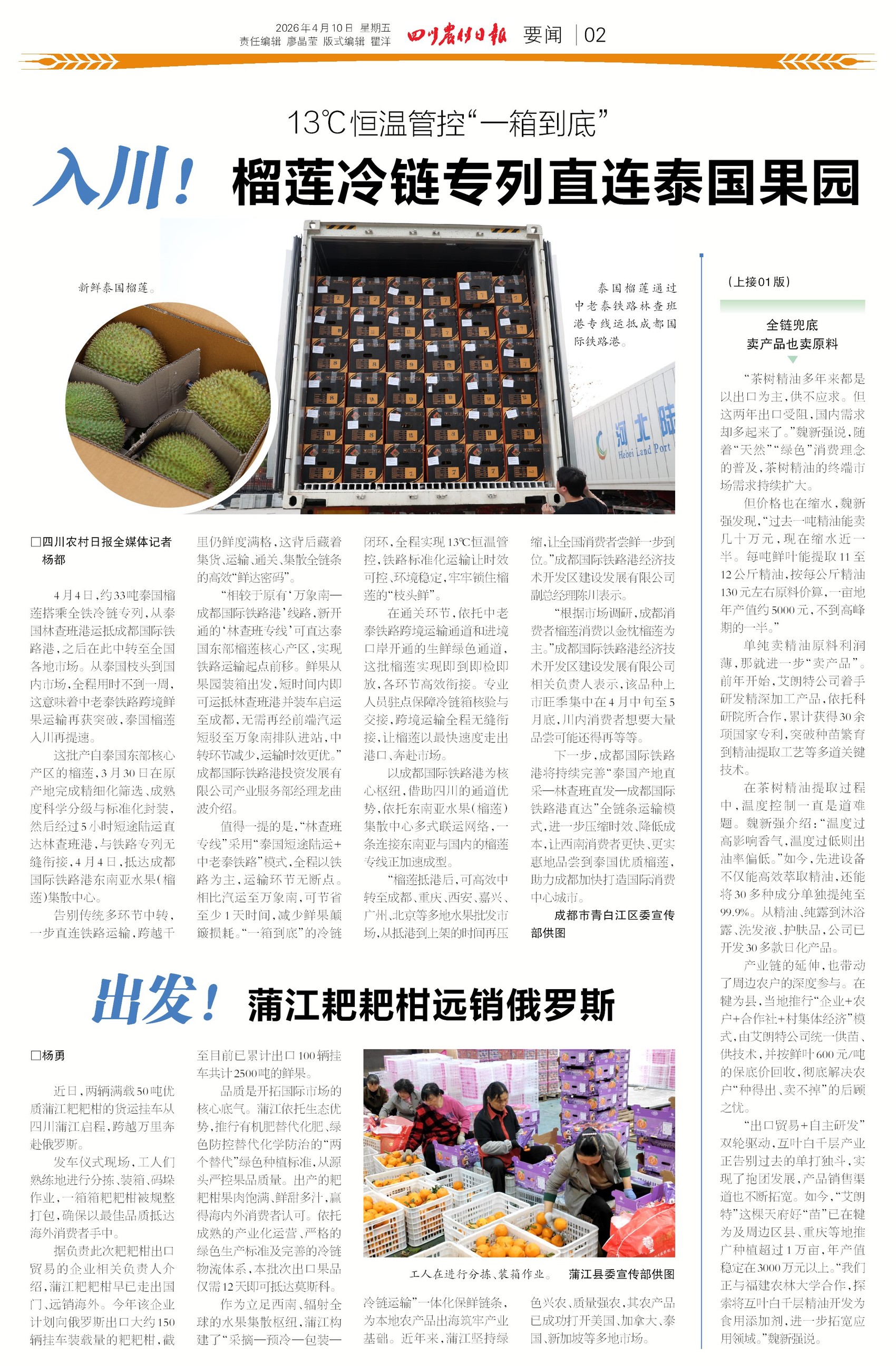 从泰国果园到成都餐桌,全程不到一周!中老泰铁路再提速,“林查班专线”直达榴莲核心产区,一箱到底、恒温管控,榴莲鲜得像刚从树上摘下来。同时,蒲江耙耙柑也坐上冷链专列远销俄罗斯,川果出海跑出加速度。