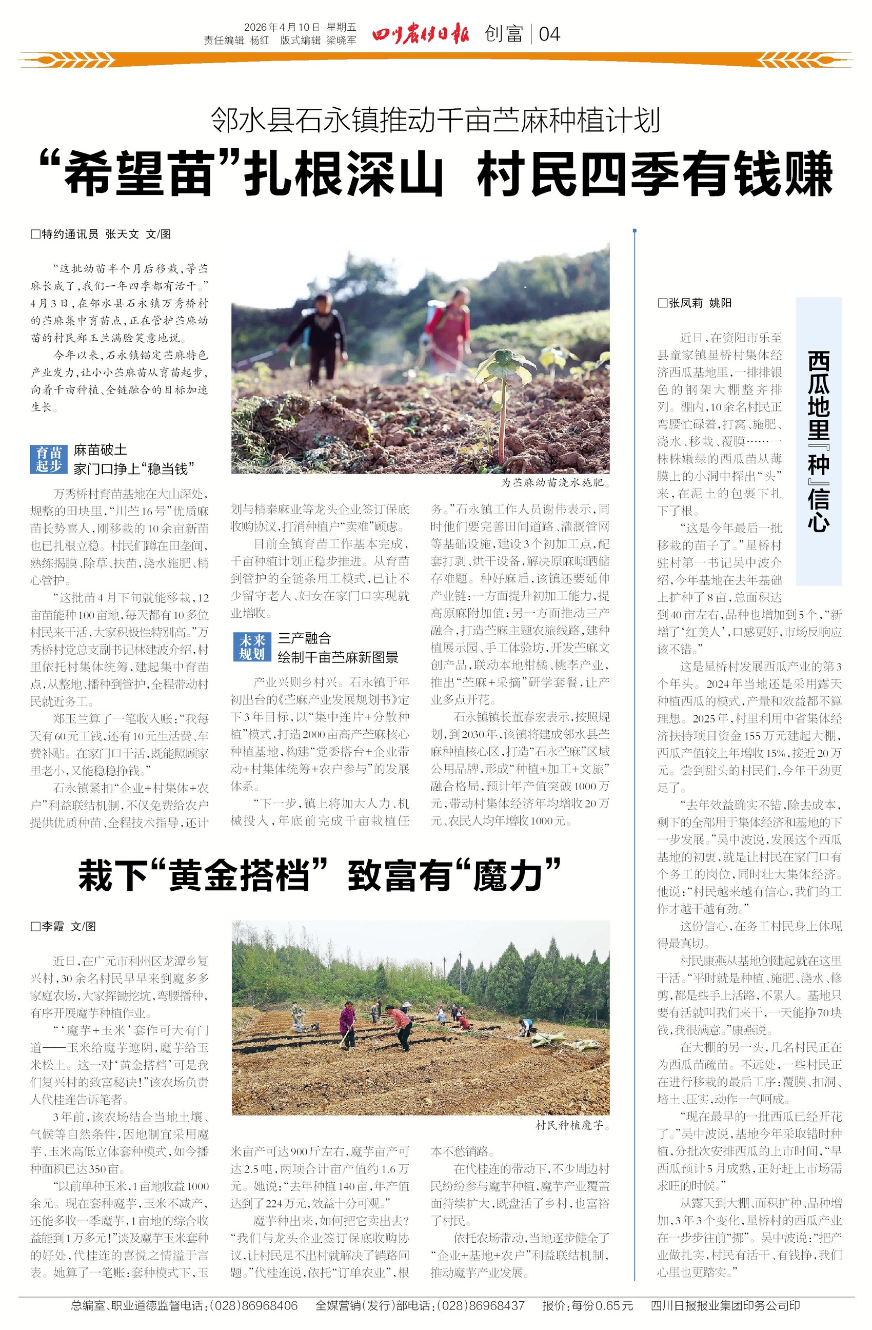 邻水县石永镇种下千亩“川苎16号”,育苗、移栽、管护全链条用工,留守老人、妇女在家门口一天挣70块。更绝的是“魔芋+玉米”黄金搭档:玉米给魔芋遮阴,魔芋给玉米松土,一亩综合收益1.6万元——套种套出致富“魔力”!