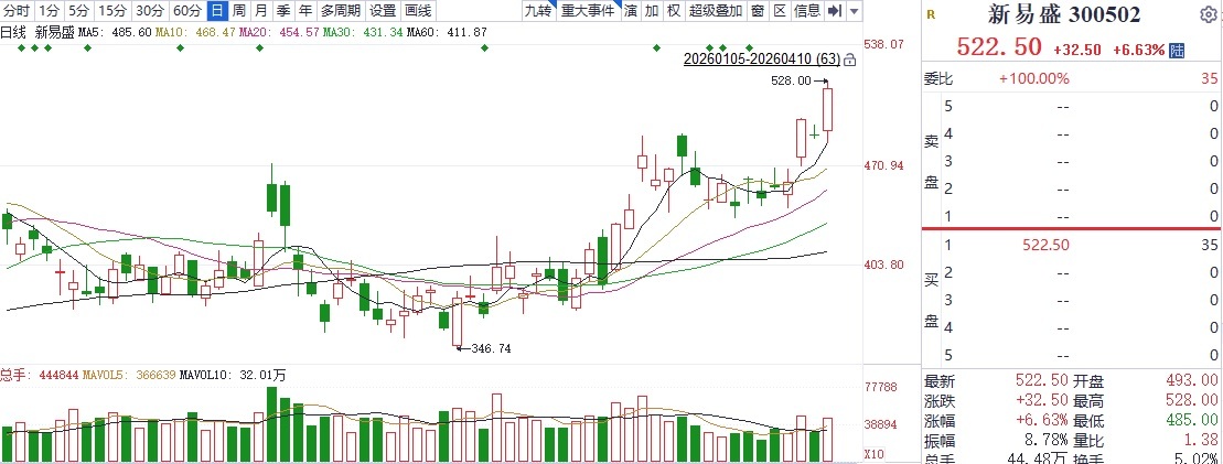 具体来看,新易盛市值突破5000亿元发生在4月10日。在经过充分蓄势后,新易盛开始发力冲高,10日该股高开高走,早盘市值已成功站上5000亿,午后在多头资金持续流入推动下,股价进一步向高点抬升,盘中股价最高摸至528元。截至收盘,新易盛报522.5元,涨幅达到6.63%,股价刷新上市以来的历史新高,总市值也来到了5193.7亿元。