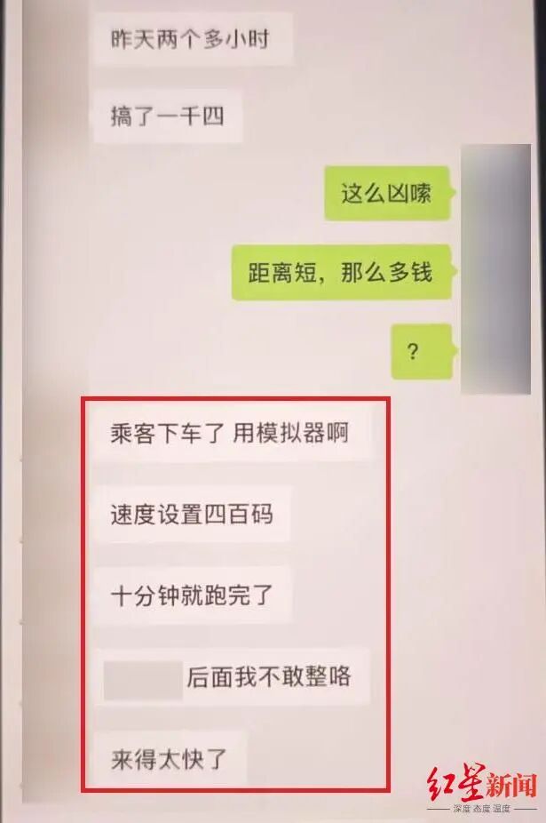 聊天记录显示,有网约车司机称“乘客下车了,用模拟器啊,速度设置四百码,十分钟跑完了”“两个多小时搞了一千四(元)”“后面我不敢整咯,(钱)来得太快了”。
