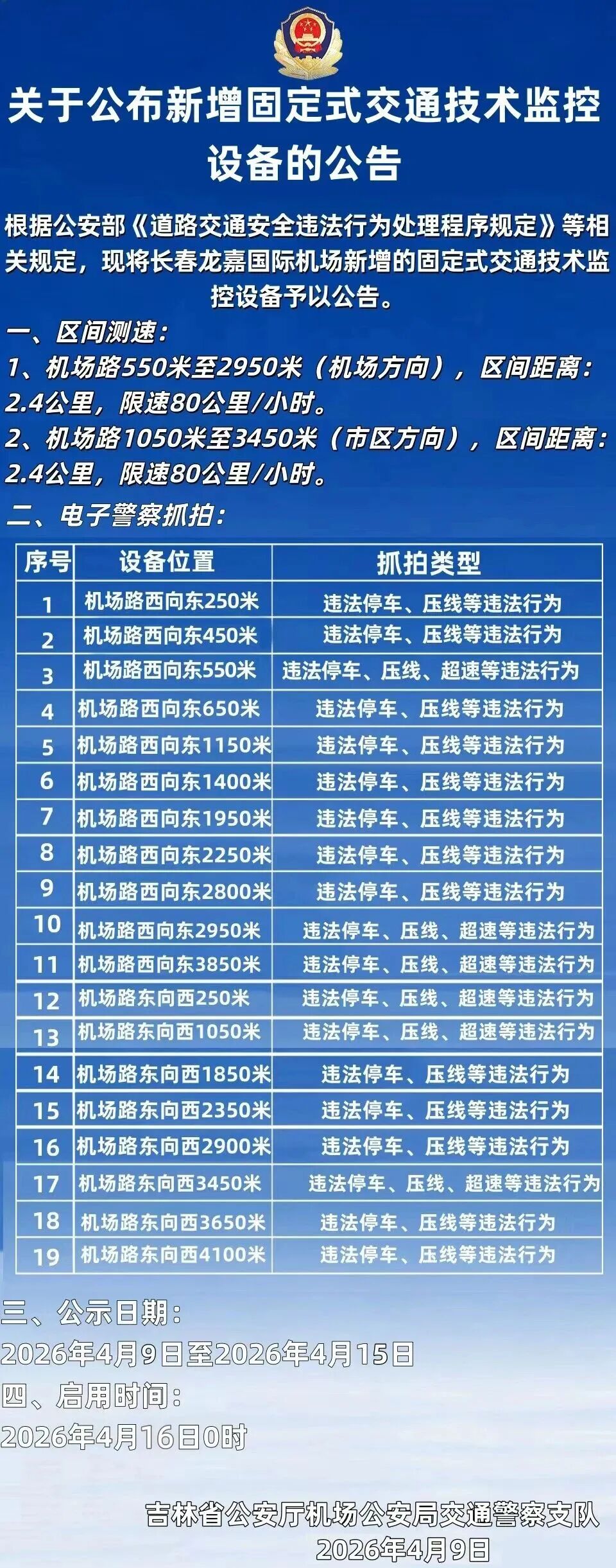 4月9日,吉林省公安厅机场公安局微信公众号发布《关于公布新增固定式交通技术监控设备的公告》——