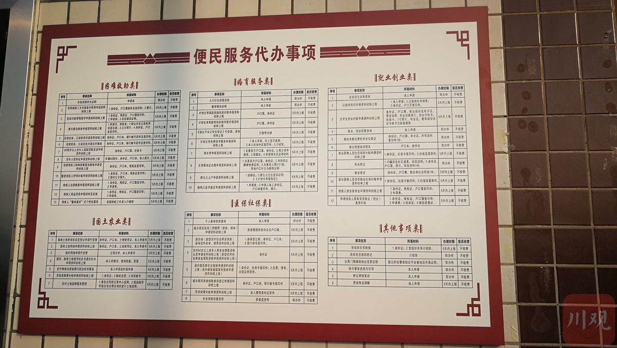 记者看到,在金紫铺村便民服务代办点的外墙上,张贴有资中县惠民政策一览表、便民服务代办事项和代办员公示牌。其中,便民服务代办事项分为了6大类,每一项都清楚地写明了所需材料和办理时限。代办员公示牌上则公示了代办员姓名、职务、联系电话、联系片区和微信二维码等相关信息。