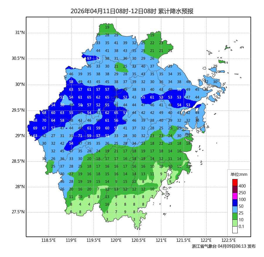 4月12日:浙北地区阴有时有阵雨,浙中南地区多云到阴部分有阵雨或雷雨。