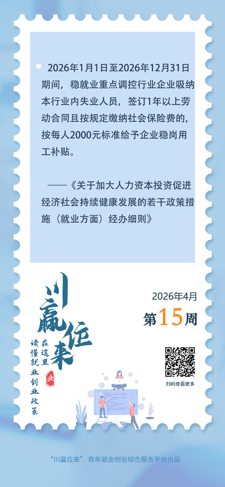 四川出台政策,用真金白银鼓励企业吸纳本行业内失业人员就业。四川省人力资源和社会保障厅近日印发的《关于加大人力资本投资促进经济社会持续健康发展的若干政策措施(就业方面)经办细则》明确, 2026年1月1日至2026年12月31日期间,稳就业重点调控行业企业吸纳本行业内失业人员,签订1年以上劳动合同且按规定缴纳社会保险费的,按每人2000元标准给予企业稳岗用工补贴。