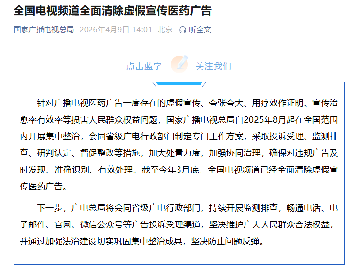 4月9日,据“国家广播电视总局”官微:针对广播电视医药广告一度存在的虚假宣传、夸张夸大、用疗效作证明、宣传治愈率有效率等损害人民群众权益问题,国家广播电视总局自2025年8月起在全国范围内开展集中整治,会同省级广电行政部门制定专门工作方案,采取投诉受理、监测排查、研判认定、督促整改等措施,加大处置力度,加强协同治理,确保对违规广告及时发现、准确识别、有效处理。截至今年3月底,全国电视频道已经全面清除虚假宣传医药广告。