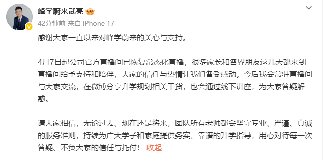 4月7日起公司官方直播间已恢复常态化直播,很多家长和各界朋友这几天都来到直播间给予支持和陪伴,大家的信任与热情让我们备受感动。今后我会常驻直播间与大家交流,在微博分享升学规划相关干货,也会通过线下讲座,为大家答疑解惑。