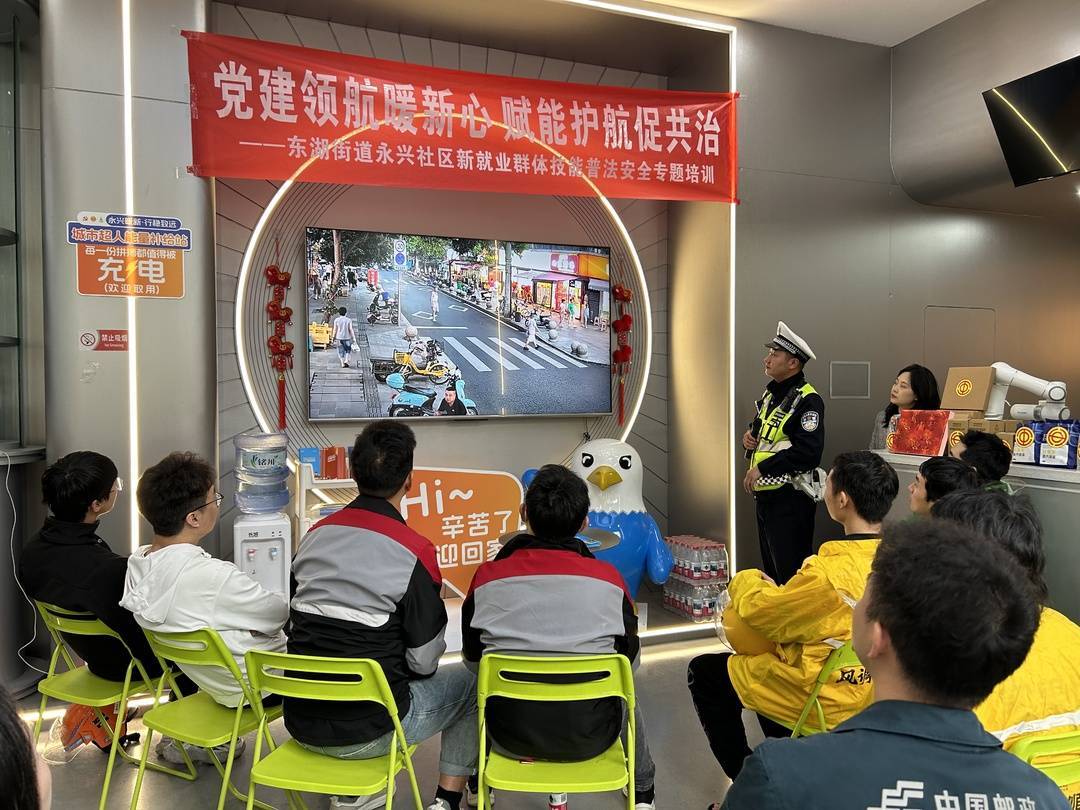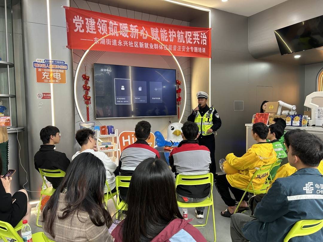 交警三分局民警则用真实事故监控视频开场,强调佩戴安全头盔、不逆行、不闯红灯、不超速等骑行规范,重点提醒路口通行和夜间行车安全。触目惊心的案例让全场鸦雀无声。“赶单不赶命,安全永远是第一。”一名外卖小哥低声对同伴说。技能、法治、安全三大课堂环环相扣,真正把服务送到了新就业群体的心坎上。