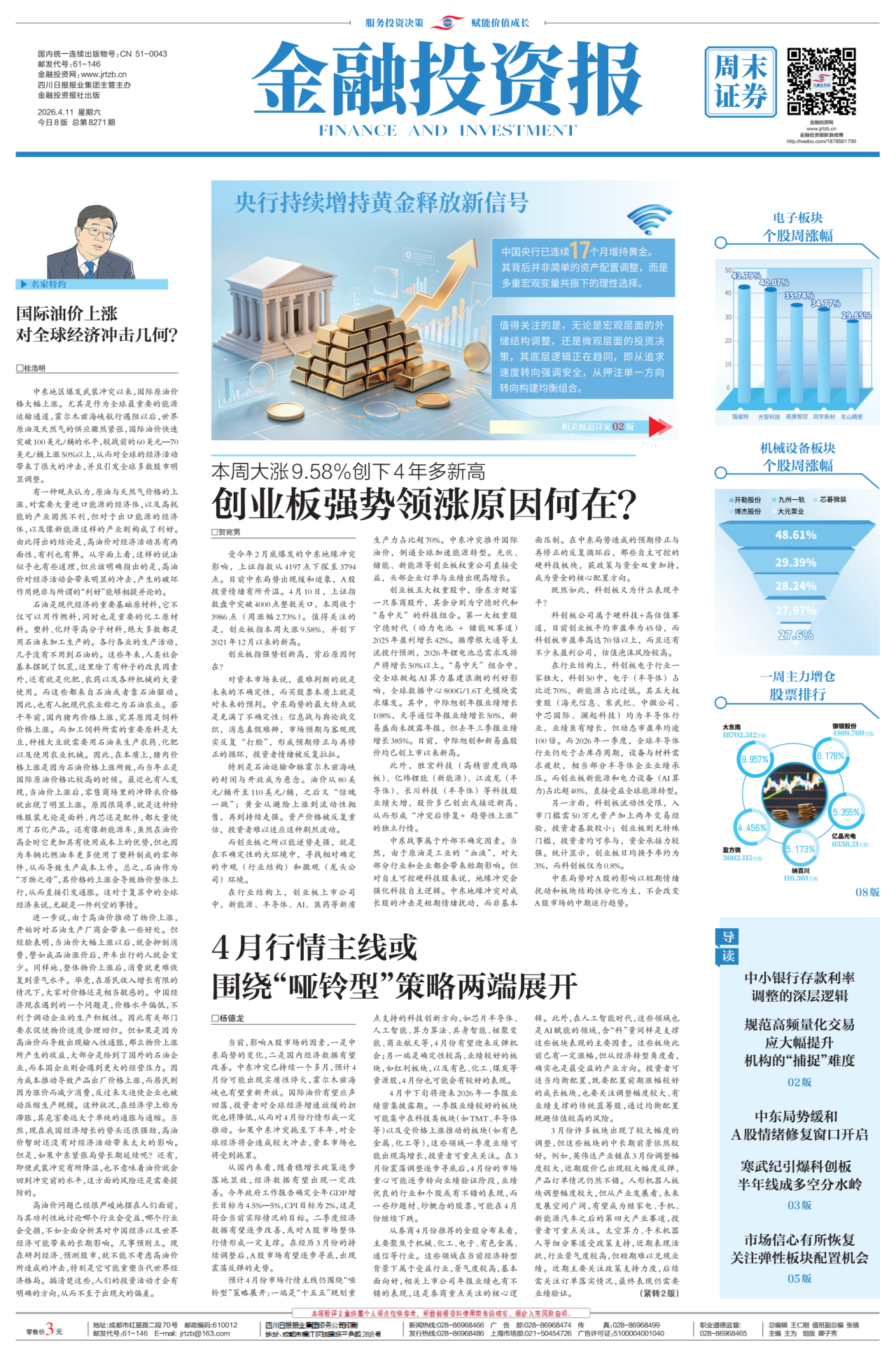 预计4月份市场行情主线仍围绕“哑铃型”策略展开:一端是“十五五”规划重点支持的科技创新方向,如芯片半导体、人工智能、算力算法、具身智能、可控核聚变、商业航天等;另一端是确定性较高、业绩较好的板块,如红利板块,以及有色、化工、煤炭等资源股。