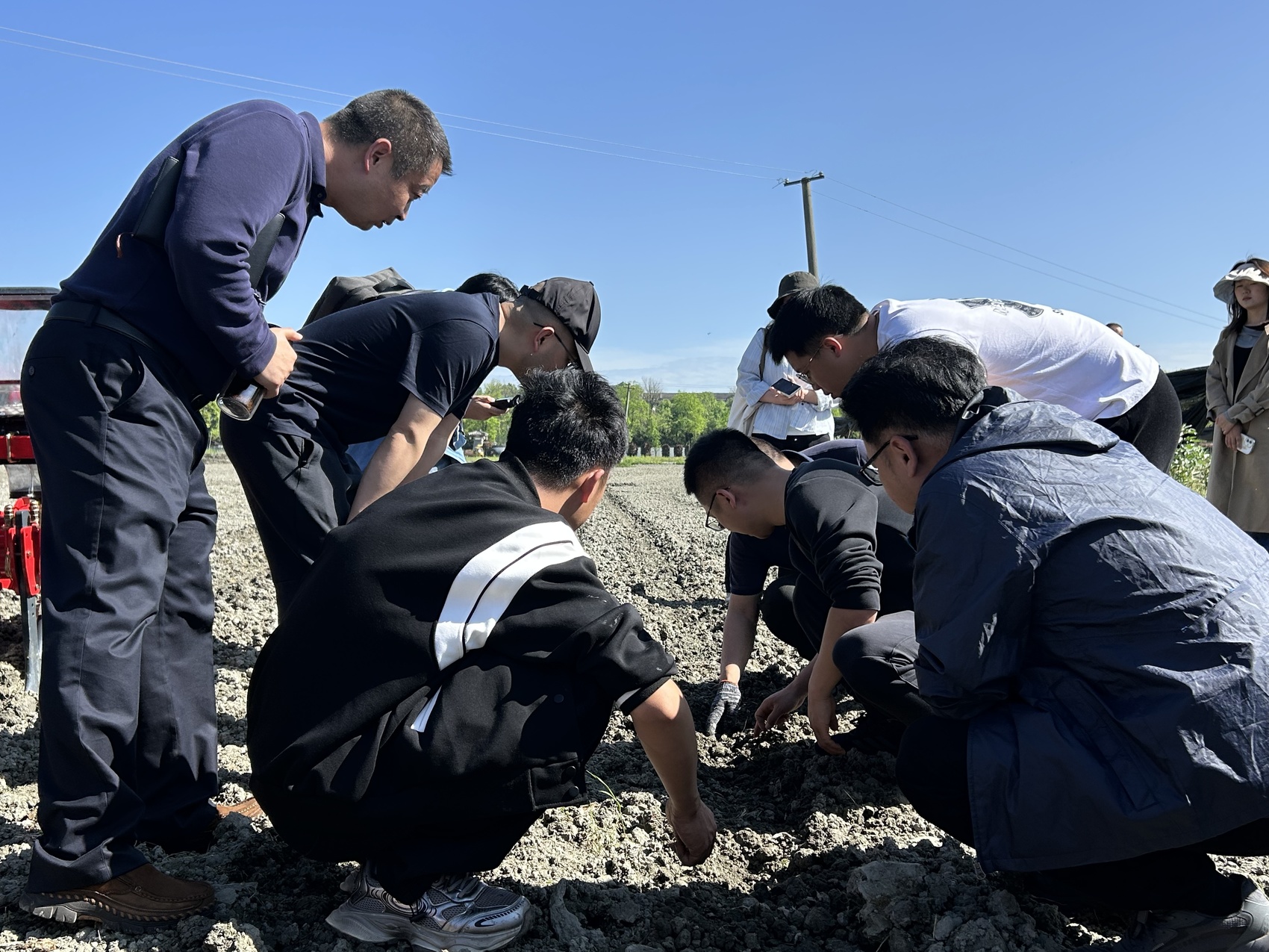 大家蹲在地上查看农机漏播情况。