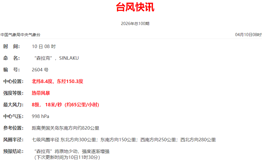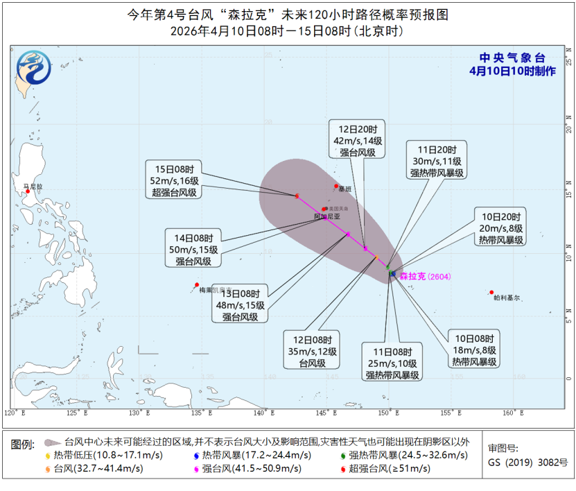 预计,“森拉克”先将原地少动,而后向西北方向移动,强度逐渐加强,13日夜间逐渐靠近美国关岛附近洋面。预计最强可达强台风级或超强台风级(50-55米/秒,15-16级)。未来“森拉克”对我国近海无影响。