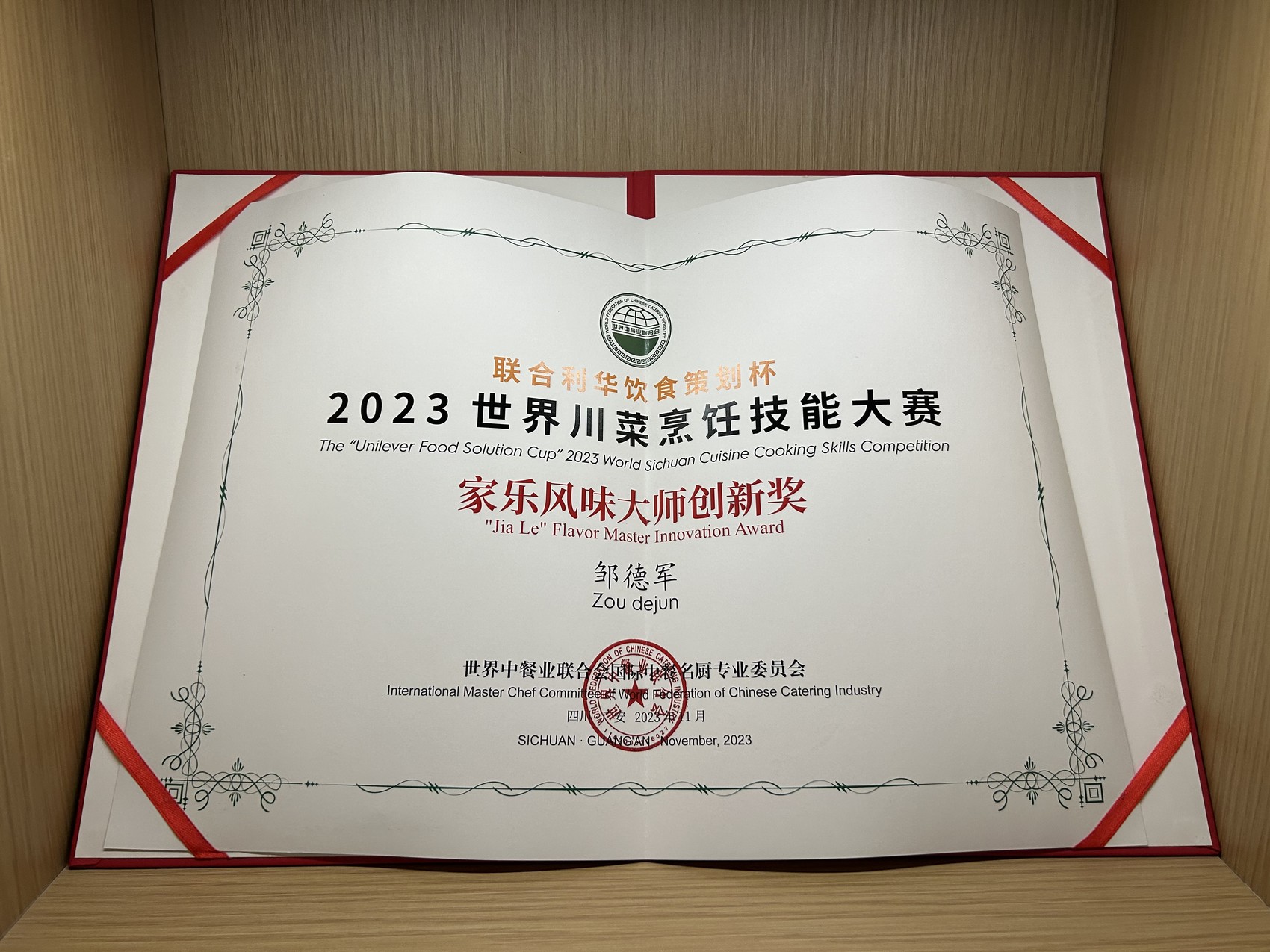 邹德军获奖证书。(胡力文 摄)