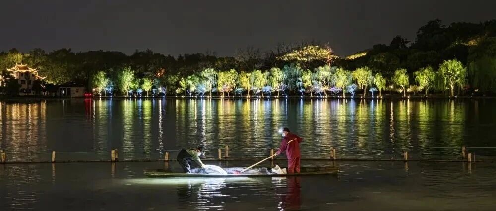 4月8日晚,工作人员在西湖清理荷塘。(受访者供图)