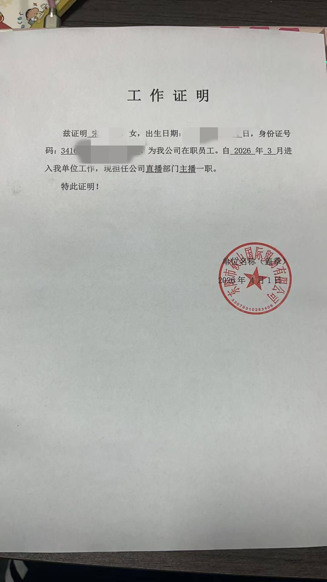 3月27日,已有两年直播带货经验的宋女士入职东阳市筱山国际贸易有限公司,成为实习带货主播,约定底薪7000元,实习满1个月自动转正。双方未签定劳动合同,但公司为她出具了一份加盖公章的《工作证明》,写明“为我公司在职员工,担任直播部门主播”。她的工作内容是每天直播4小时,每2小时休息一次。