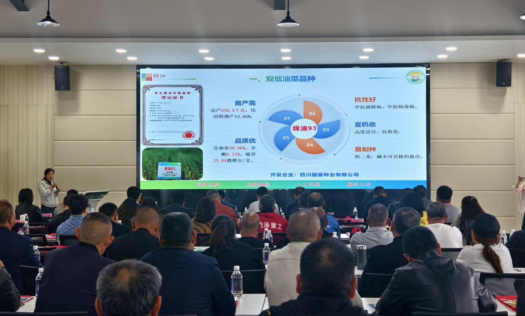 首先是播好“第一粒种”。针对连阴雨导致无法下地的问题,绵阳市农科院油料所副所长刘念带来了适配四川气候的高产高油、多抗油菜品种矩阵,兼顾菜油两用、工业专用与机械化种植。四川国豪种业研究员卢庭启更是现场划重点,强推了“绵油93”和“绵油51”两款迟播利器。“绵油93”甚至可拖至11月上旬播种,避开低温出苗难的“死结”。同时,晚播还能让根肿病无机可乘,加之“绵油93”适宜机收、抗裂角,真正实现了“种得晚、长得好、收得省”。