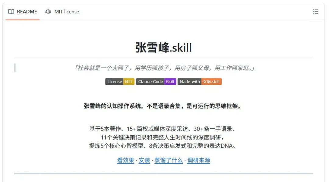 根据技能包网页介绍,开发者基于5本著作、15篇权威媒体深度采访、30多条一手语录、11个关键决策记录和完整的人生时间线深度调研,提炼出5个核心心智模型、8条决策启发式和完整的“表达DNA”。项目强调,其每段回应都在运用张雪峰的具体心智模型,不复读语录,而是使用张雪峰的认知框架分析问题,并展示了多个咨询场景的效果示例。网页还列举了其他skill,宣称每个都可独立安装,其中有乔布斯.skill,专攻领域是产品设计和战略,还有马斯克.skill,领域是工程等方面。