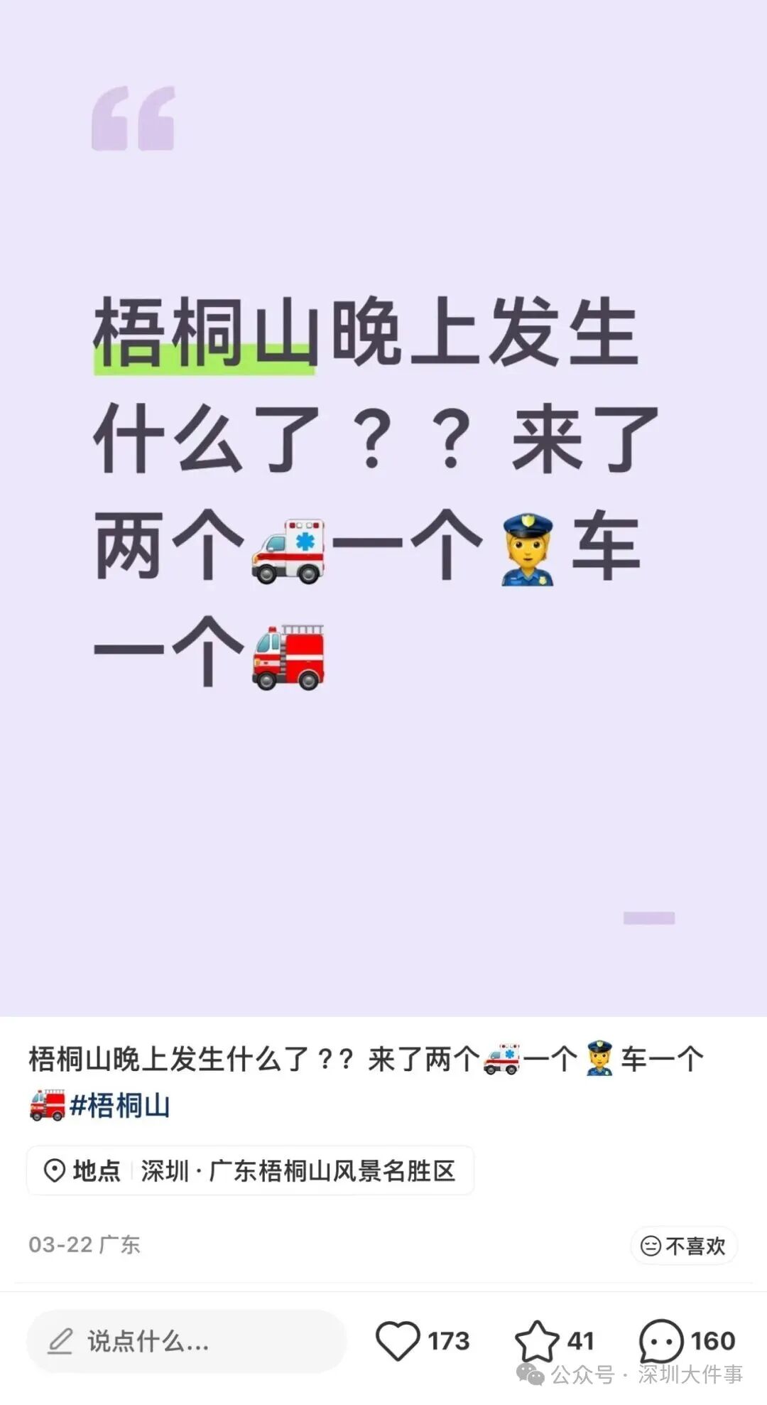 鉴于救护车无法抵达事发地,10:40,深圳120接到报警后,迅速派出罗湖区中医院救护车赶往凌云道入口处,同步预启动航空救援。