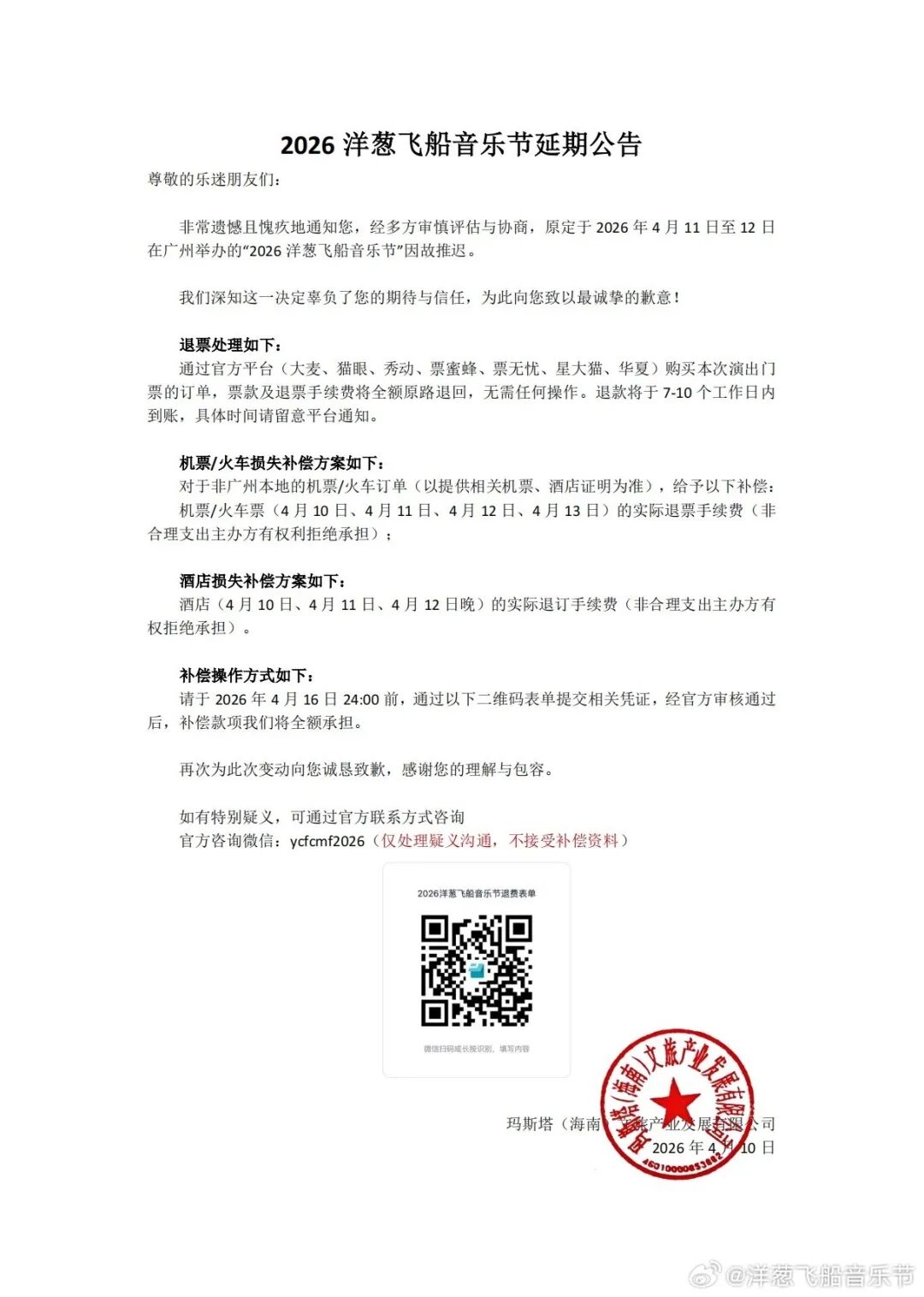 主办方发布的公告称,经多方审慎评估与协商,原定于2026年4月11日至12日在广州举办的“2026洋葱飞船音乐节”因故推迟。