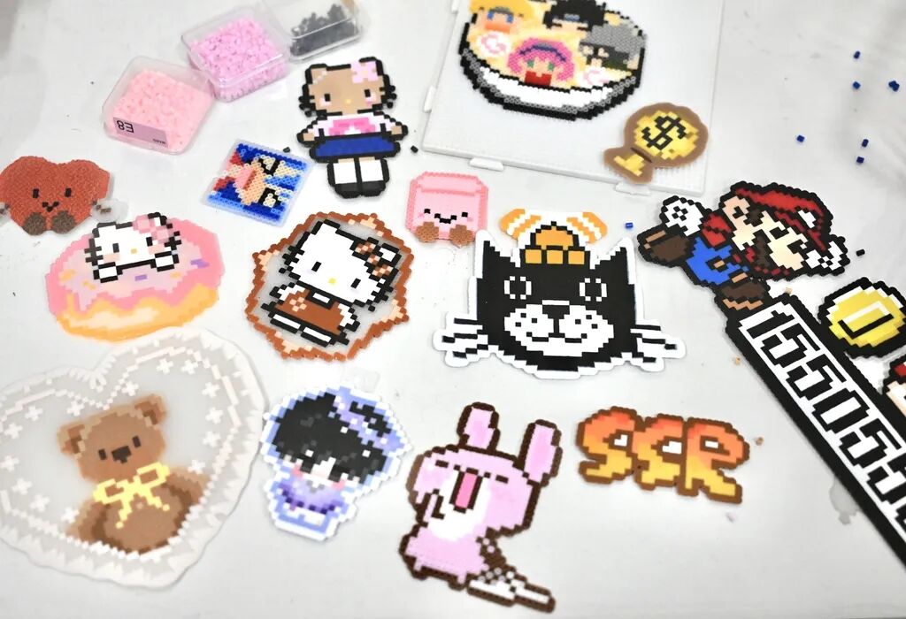 它的玩法是通过排列组合彩色塑料“豆”粒,经加热固定成型制成各种创意作品,简单来说就是先拼后烫。