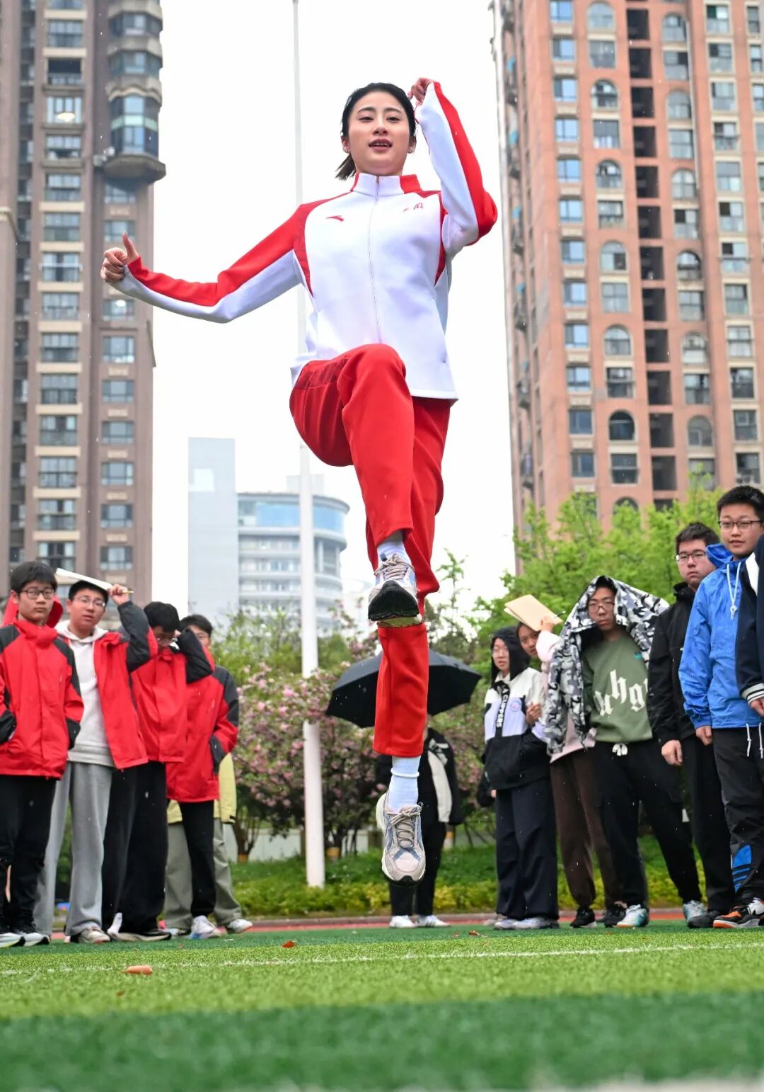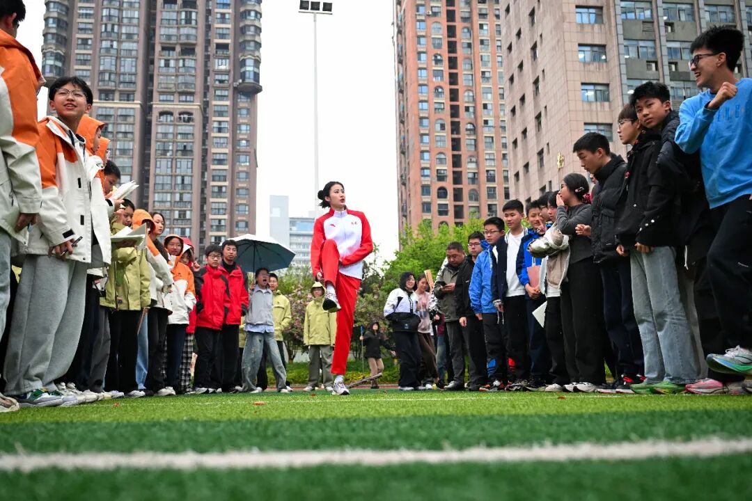 在细雨中的互动体验环节,陈婷现场展示了三级跳远技术要领,传授发力技巧。一大批同学在雨中把陈婷团团围住,索要签名、合影,陈婷一一满足了大家的要求。