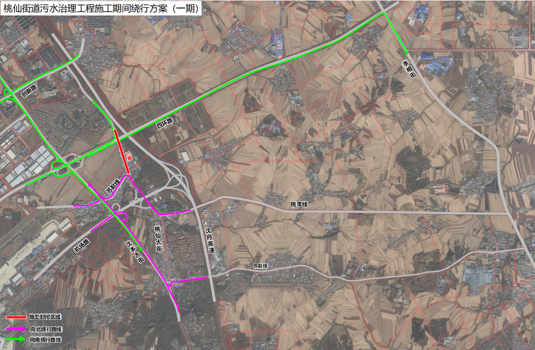 原桃仙大街南北双向通行车辆及行人,可通过沈本大街、李相街绕行。原桃仙大街的苏赵线(南线)至沈本大街段南向北方向通行车辆,可通过李相街绕行。